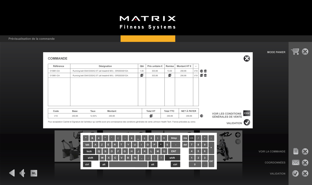 - Portfolio produits 3D temps réel permettant d'accéder à la liste des produits, leur fiche de description détaillée et l'achat en ligne automatique. La création de la facture est immédiate et sauvegardée en PDF sur l'ordinateur.